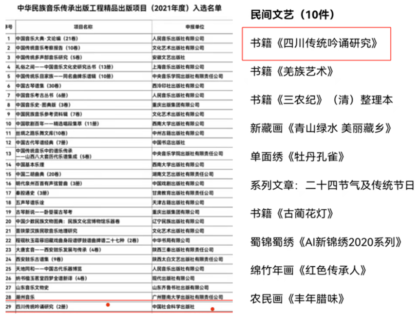 近日,中共中央宣传部中华民族音乐传承出版工程精品出版项目评审工作和四川省文联年度百家“推优工程”相继启动,经过申报、初审、复审、终审等程序,学校马克思主义学院教师王传闻专著《四川传统吟诵研究》均以高票入选。
