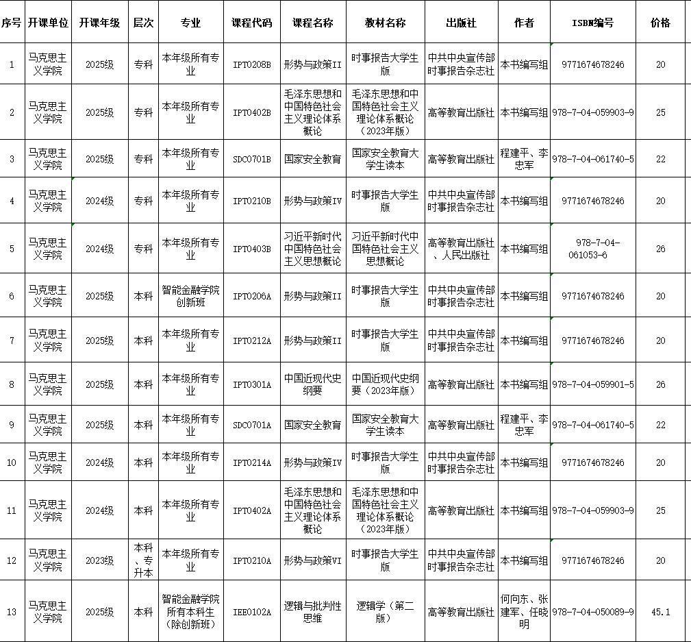 依据《普通高等学校教材管理办法》的要求,为提升教学质量,确保教学内容具备科学性与系统性,马克思主义学院经审慎研究和讨论,确定了2026年春季学期开设课程所选用的教材,现予以公示:公示期为2026年1月7日 - 2026年1月11日。若存在异议,请于公示期内反馈至马克思主义学院教材选用与审核工作组。马克思主义学院2026年1月7日